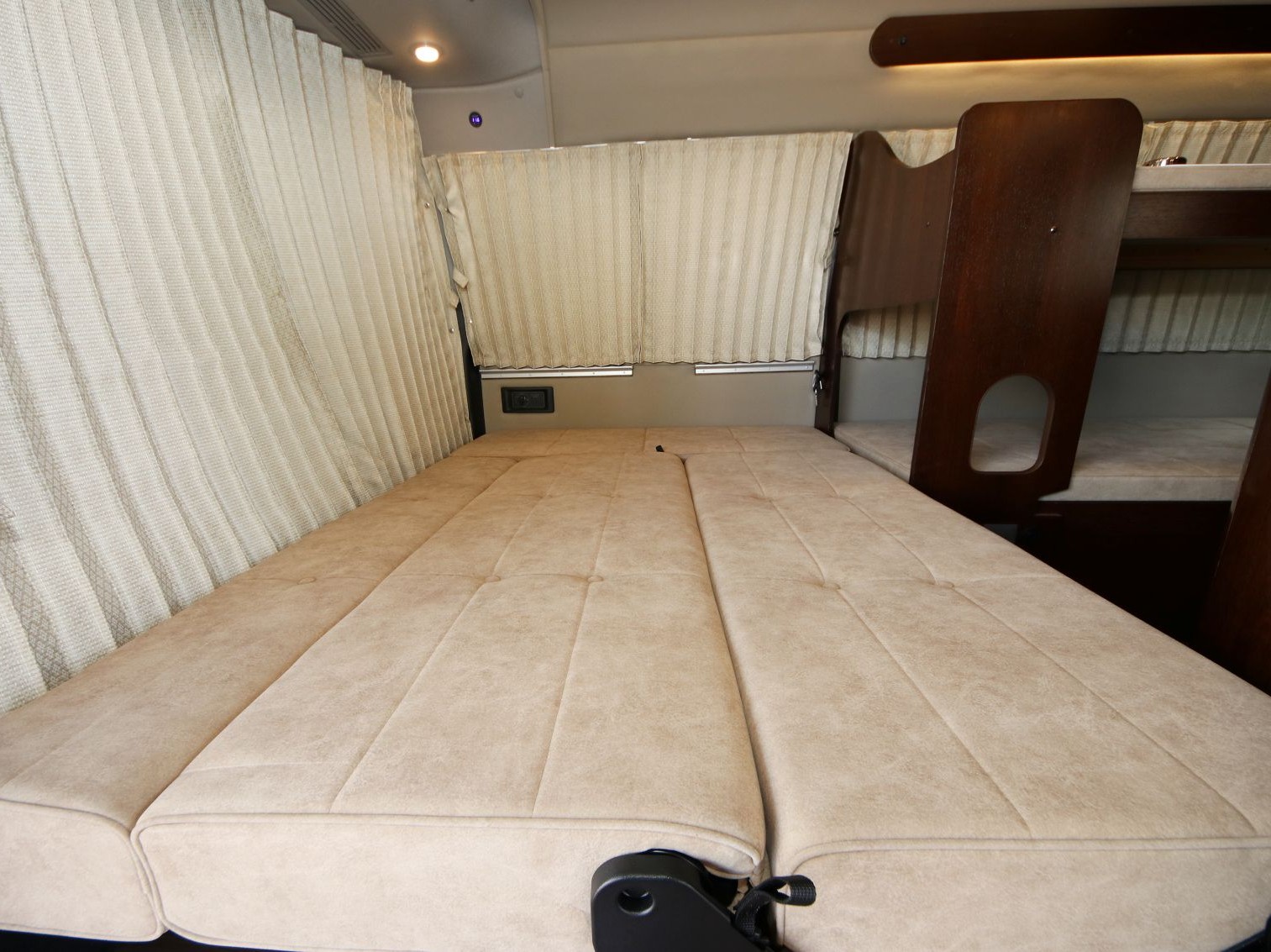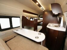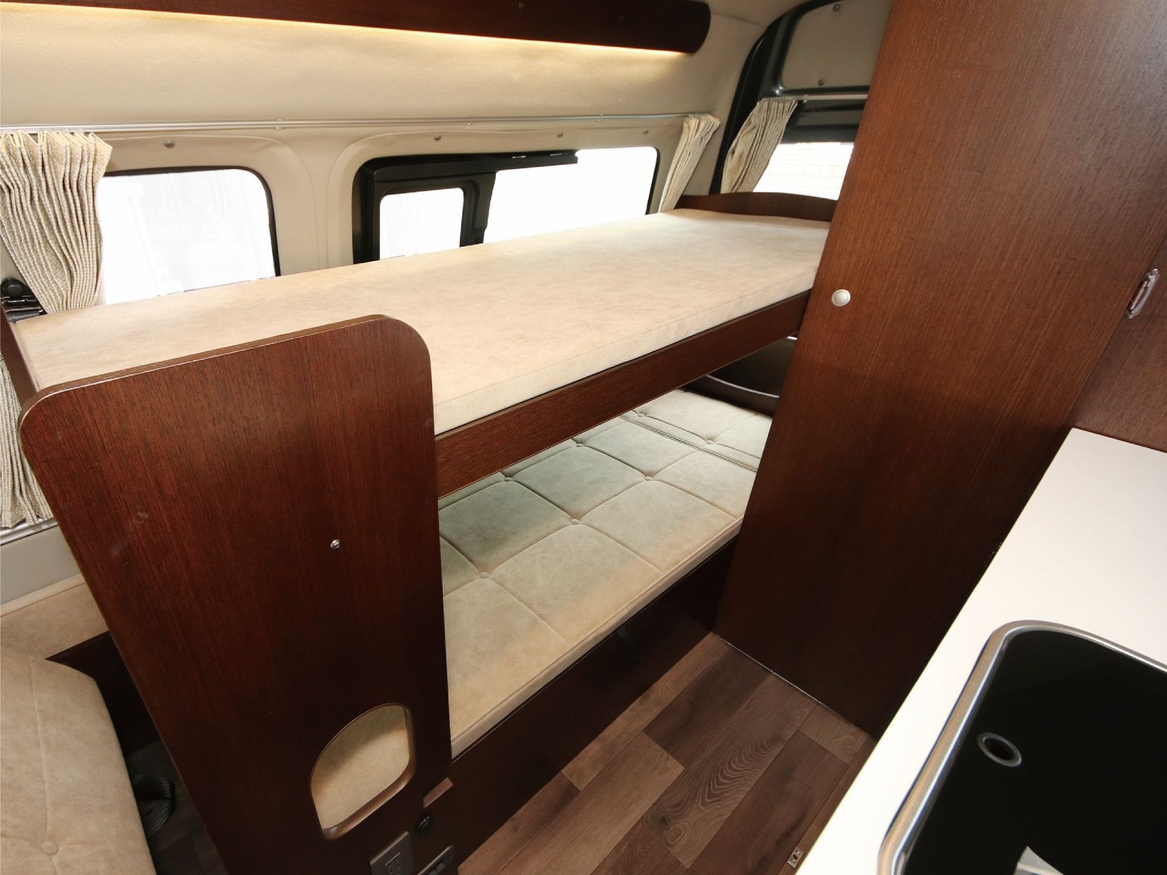 常設二段ベッドとギャレー、リヤにはマルチルームを効率良く配置。
