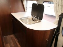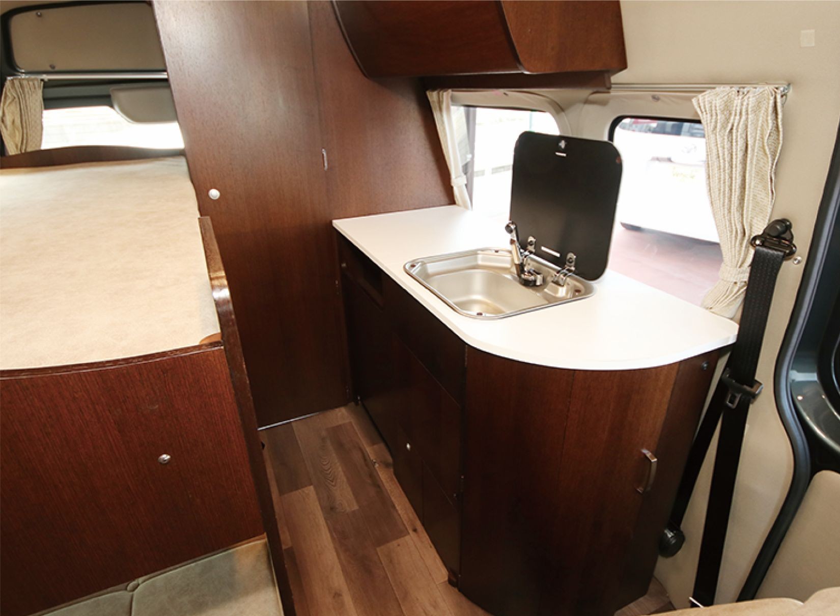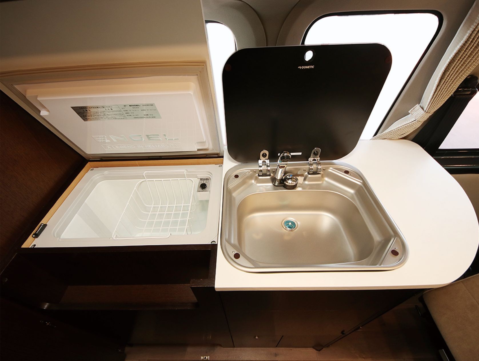 給排水タンクが取り出しやすいスライド近くにギャレーを配置。上部には照明がついています。