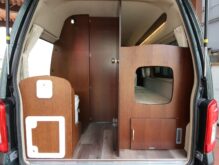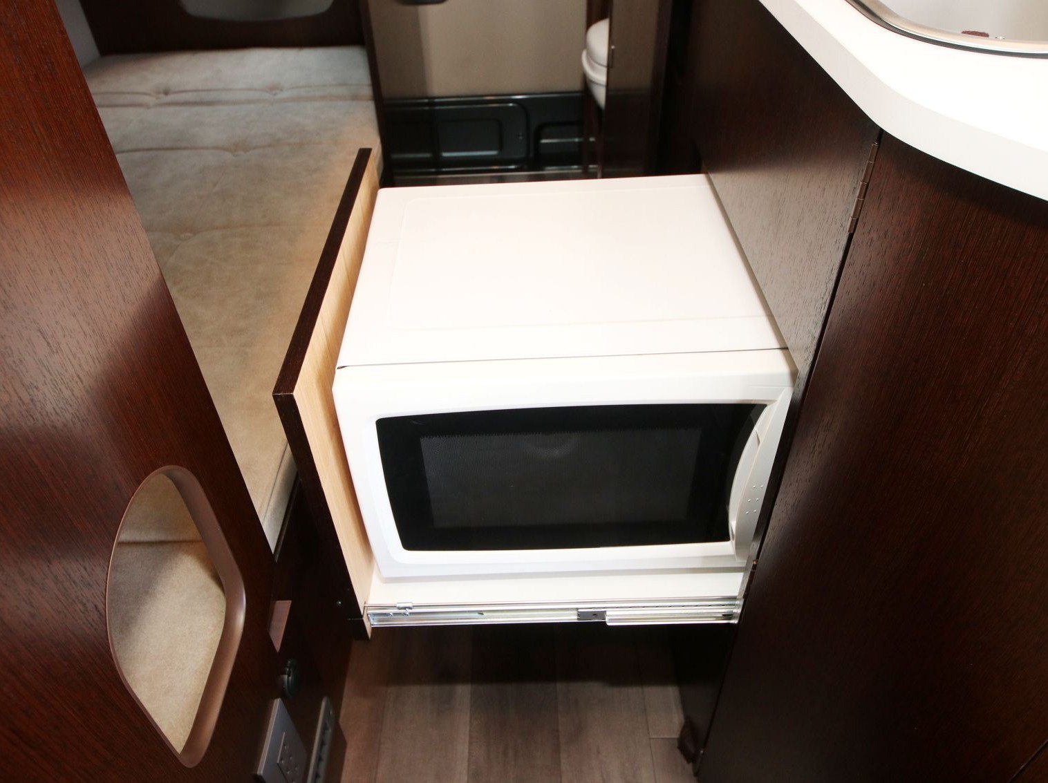 曲面のギャレー扉は半分に折れるようになっているので開口を大きく開くことが可能です。給排水タンクの容量は各10リットル。